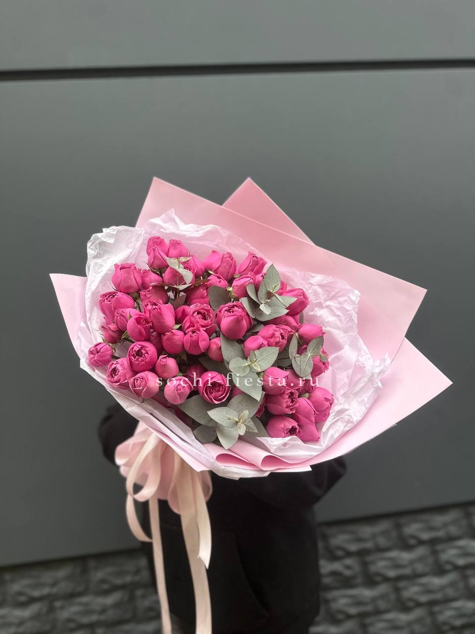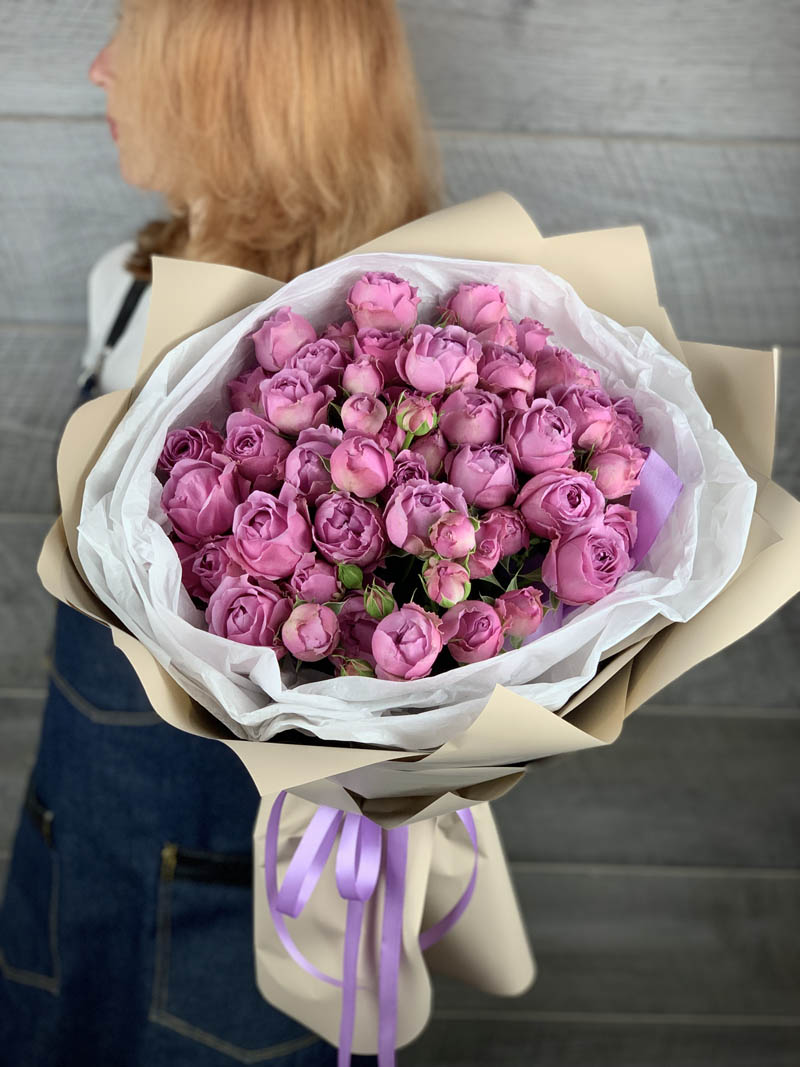 Минимальный состав: 35 пионовидных кустовых роз Мисти бабблс, лента, авторское оформление.