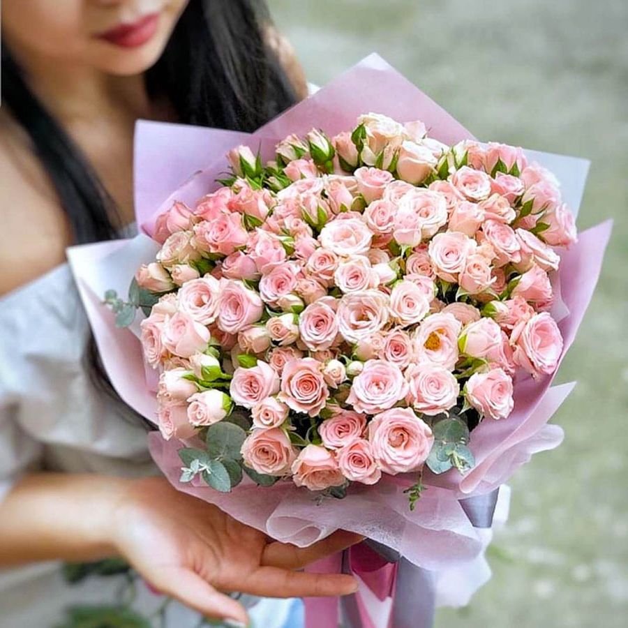 минимальный состав: 9 лавандовых пионовидных кустовых роз, лента, упаковка на выбор.