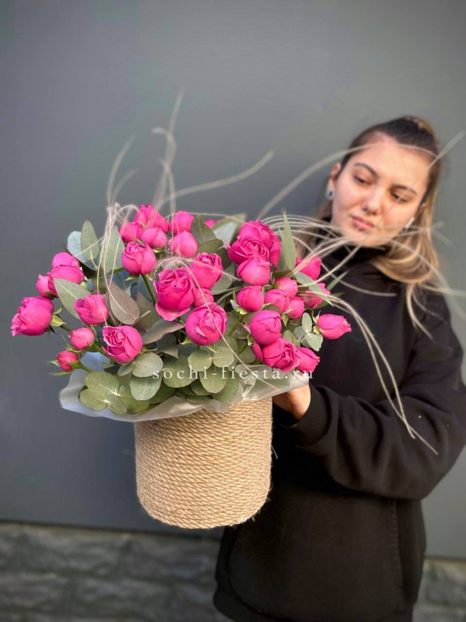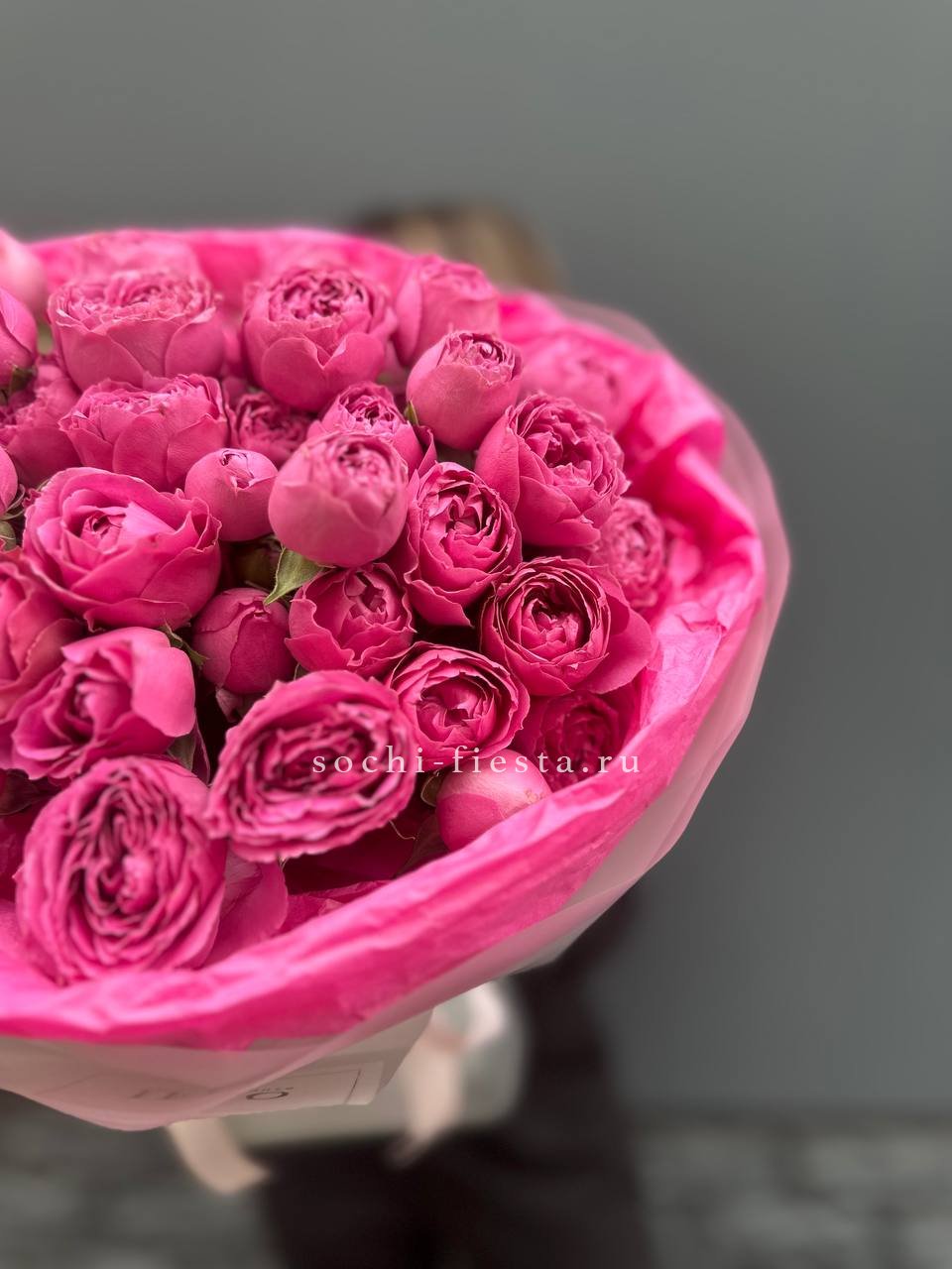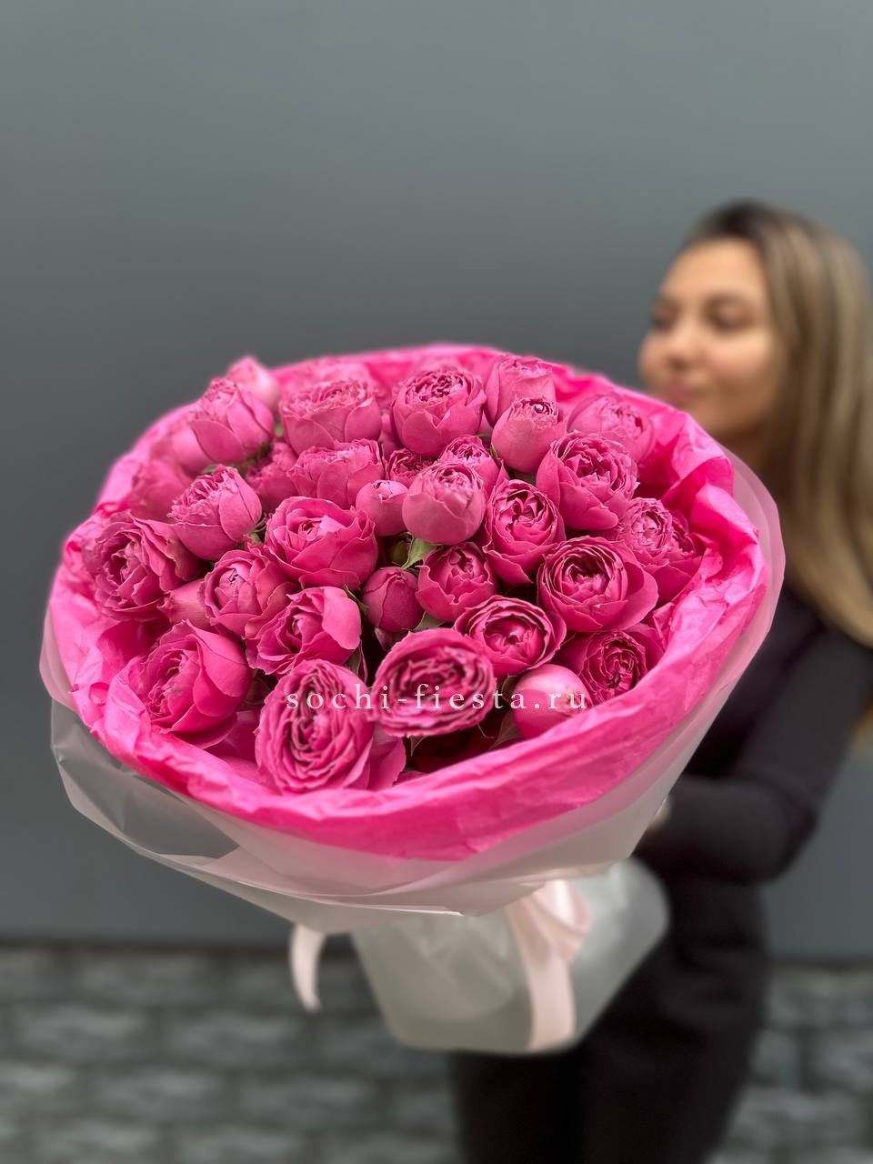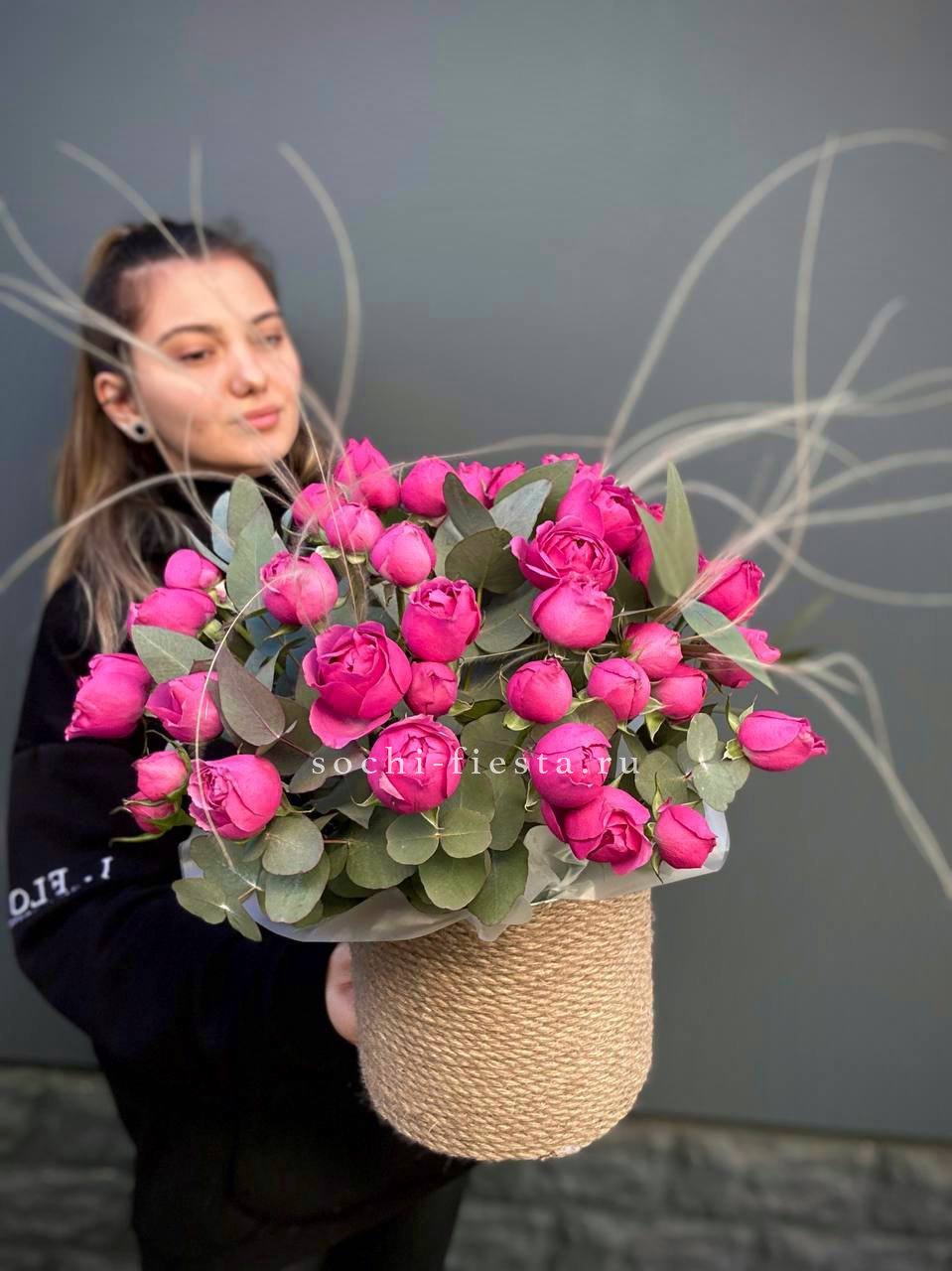 розы пионовидные 21шт, эвкалипт, пленка, лента.