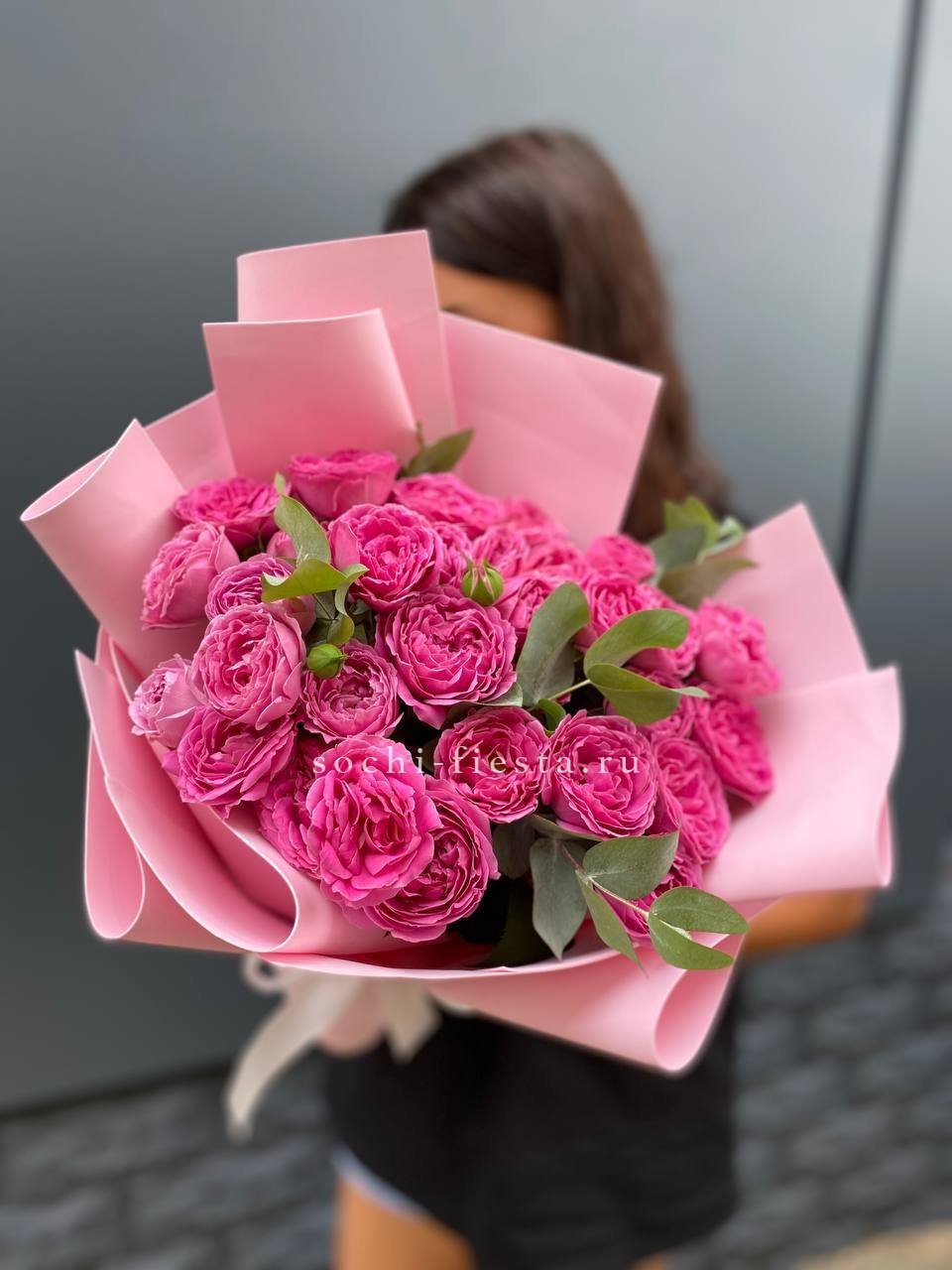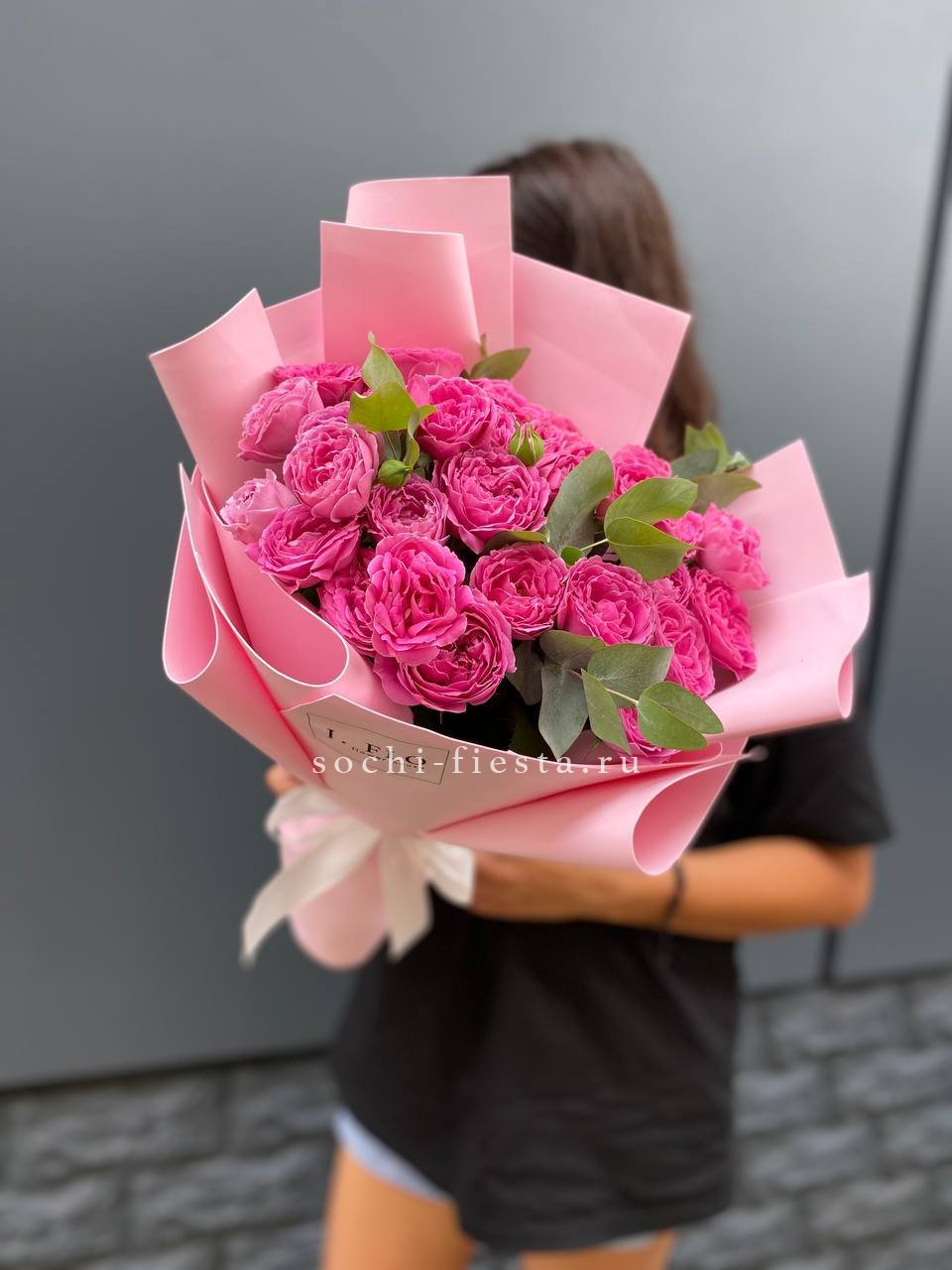 Двадцать пять пионовидных роз в плотной округлой форме создают объёмное облако нежно-розового оттенка. Сорт Pink X-Pression с густомахровыми бутонами собран под ленту без дополнительного декора.