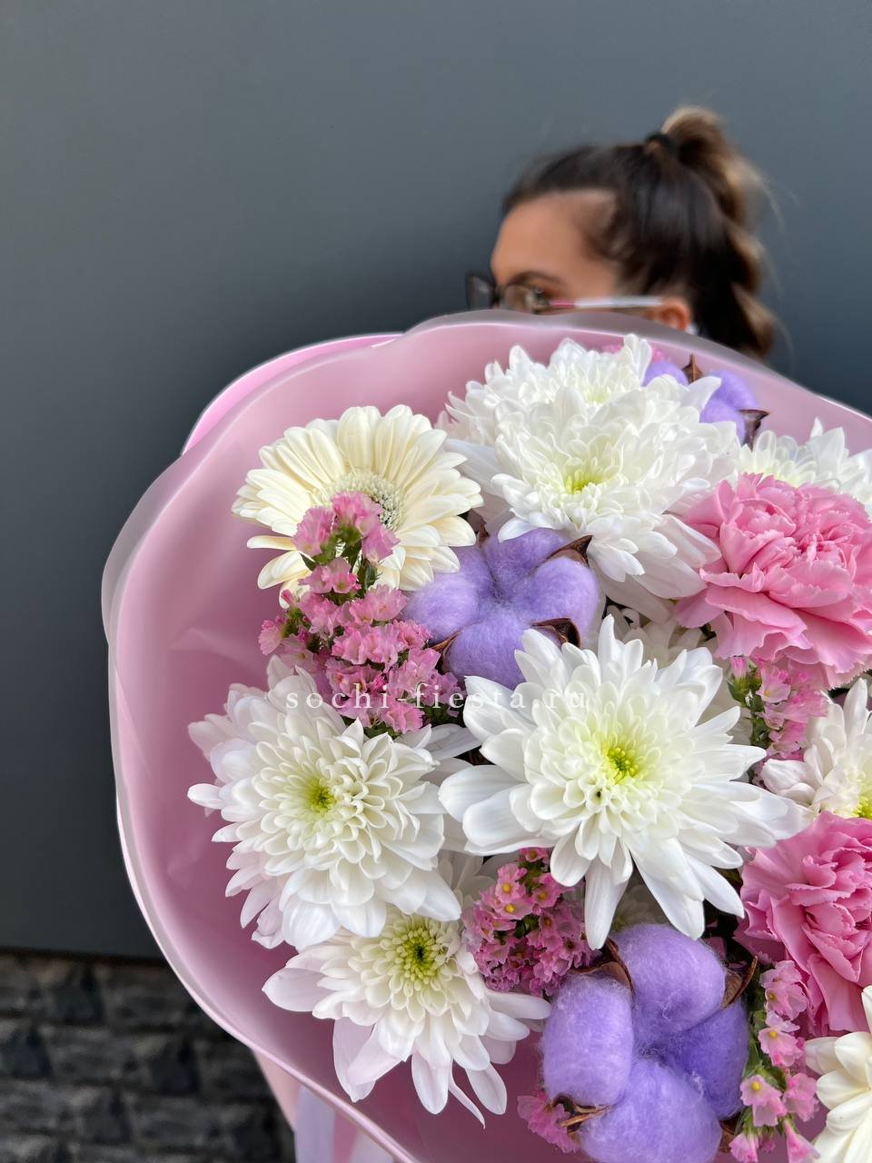герберы, хризантемы, статица (аналог), диантусы, хлопок, упаковка.