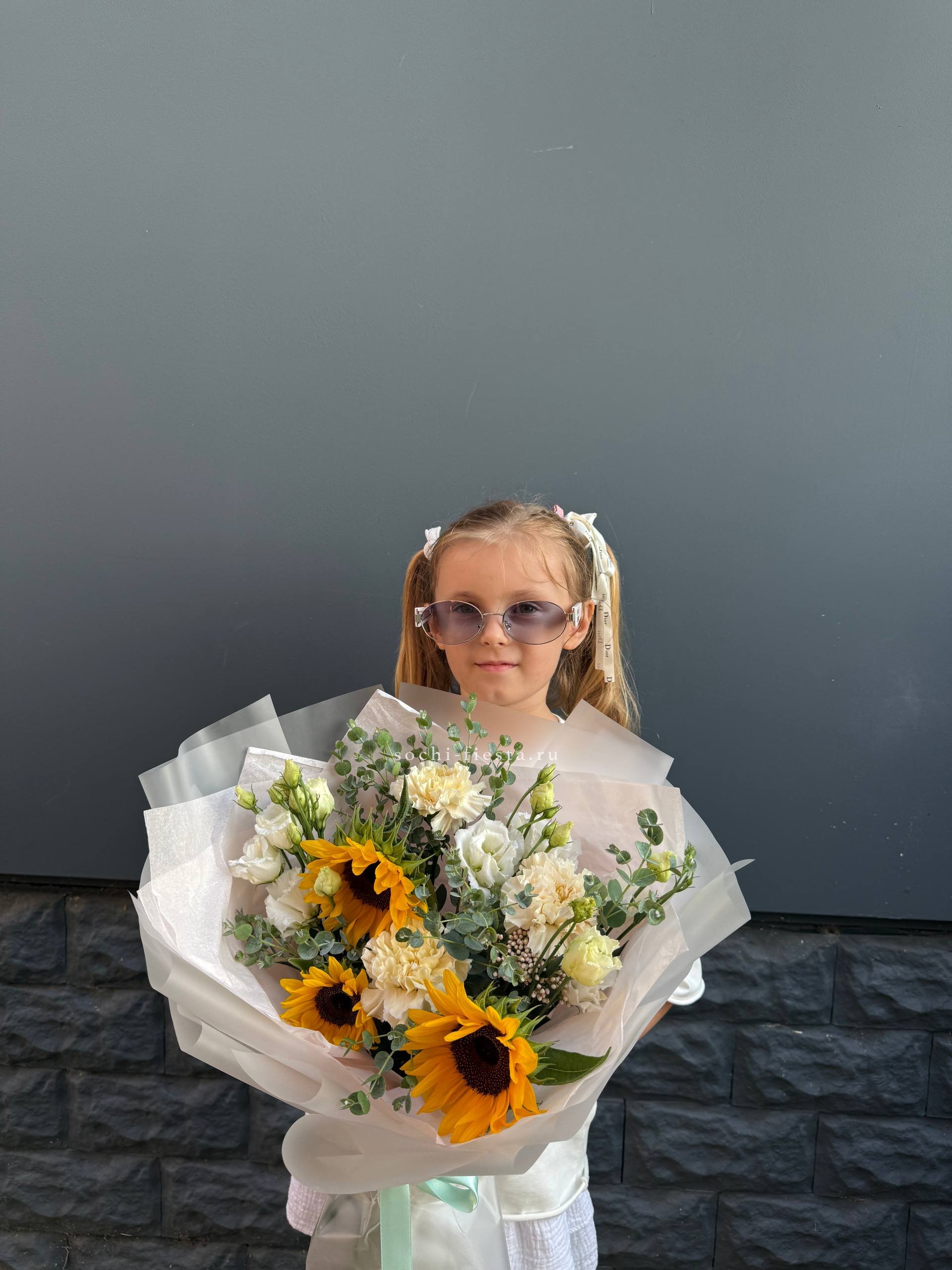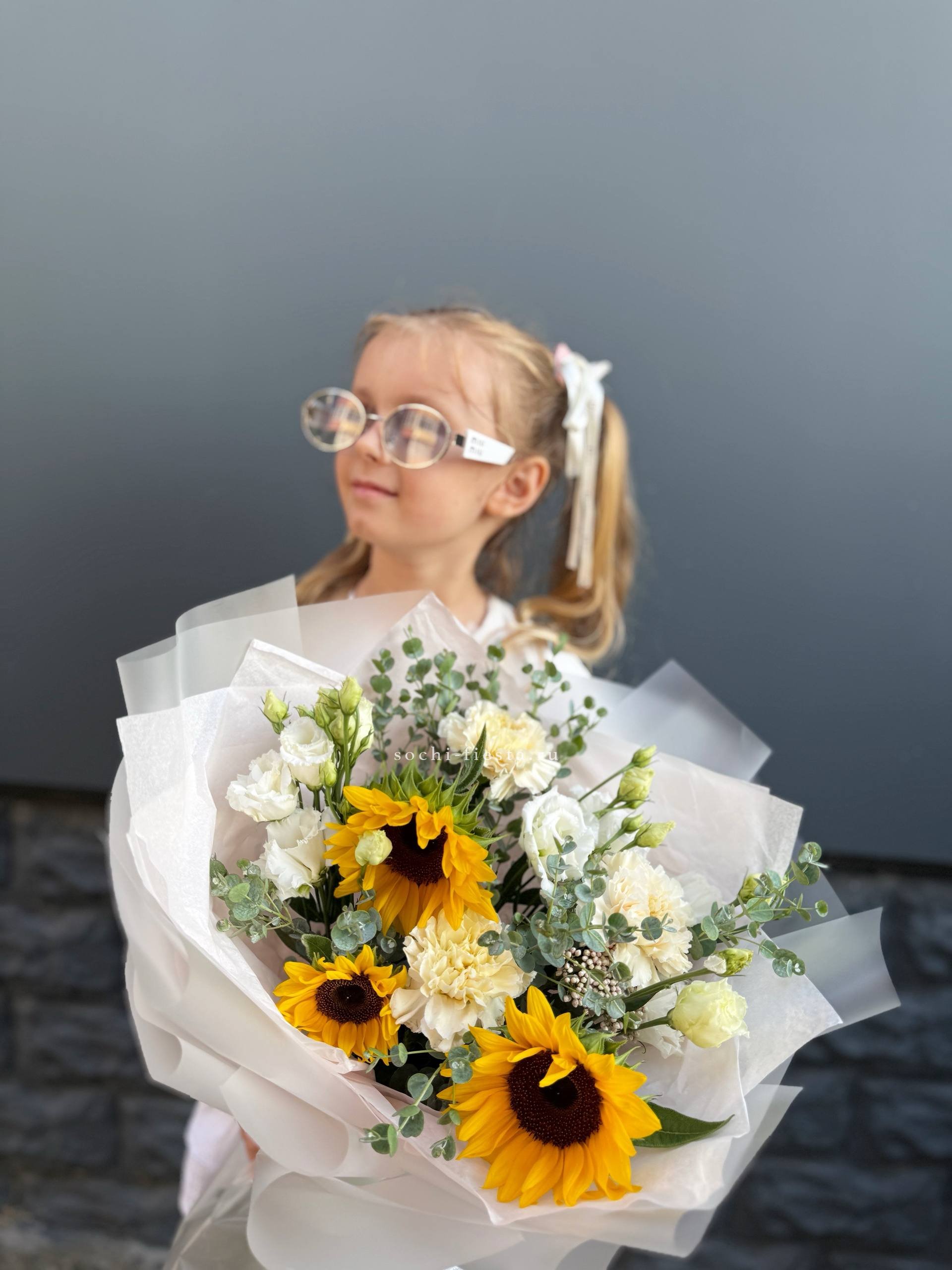 подсолнухи, диантусы, эустома, озатамус, эвкалипт, оформление.