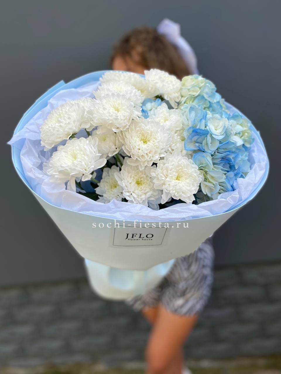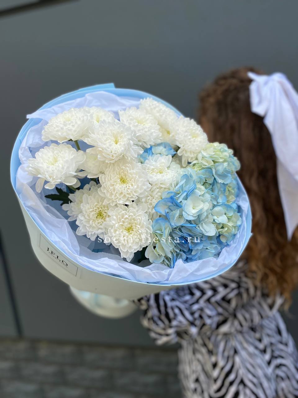 хризантема кустовая, гортензия, мисти баблс, розы в нежном оформлении.