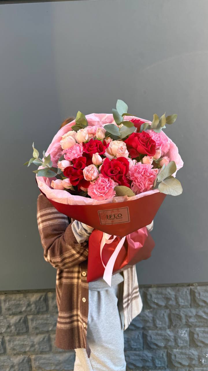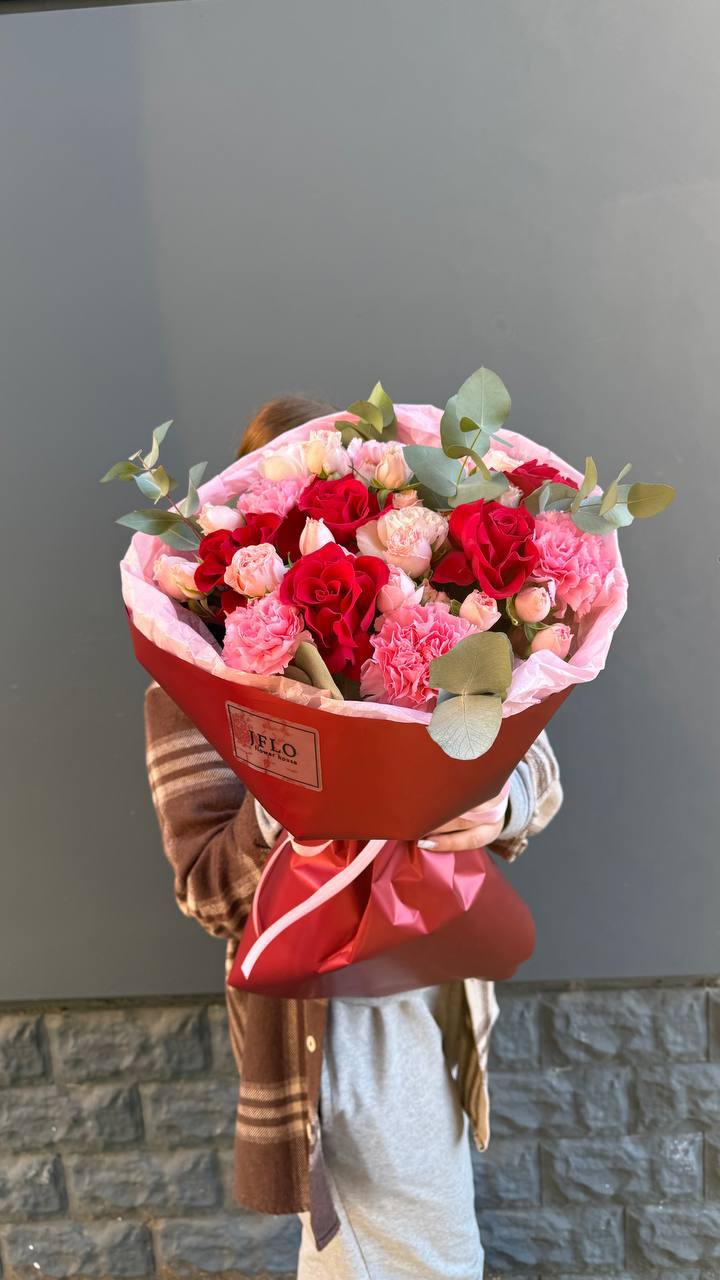Пышный авторский микс, в котором глубокий красный цвет роз гармонично дополнен зефирными оттенками диантусов и кустовых роз. Это не просто букет, а масштабное признание, которое заставляет сердце биться чаще. Подарите незабываемый WOW-эффект той, кто вам по-настоящему дорога!