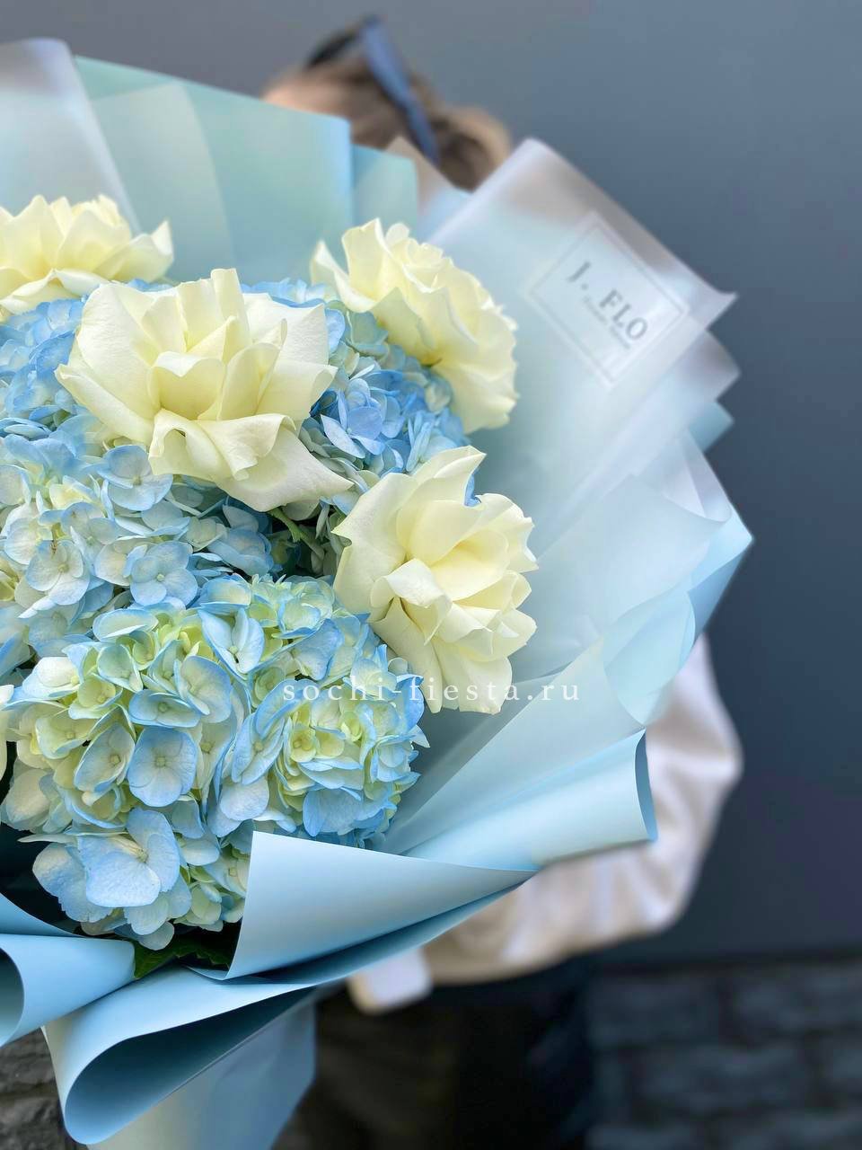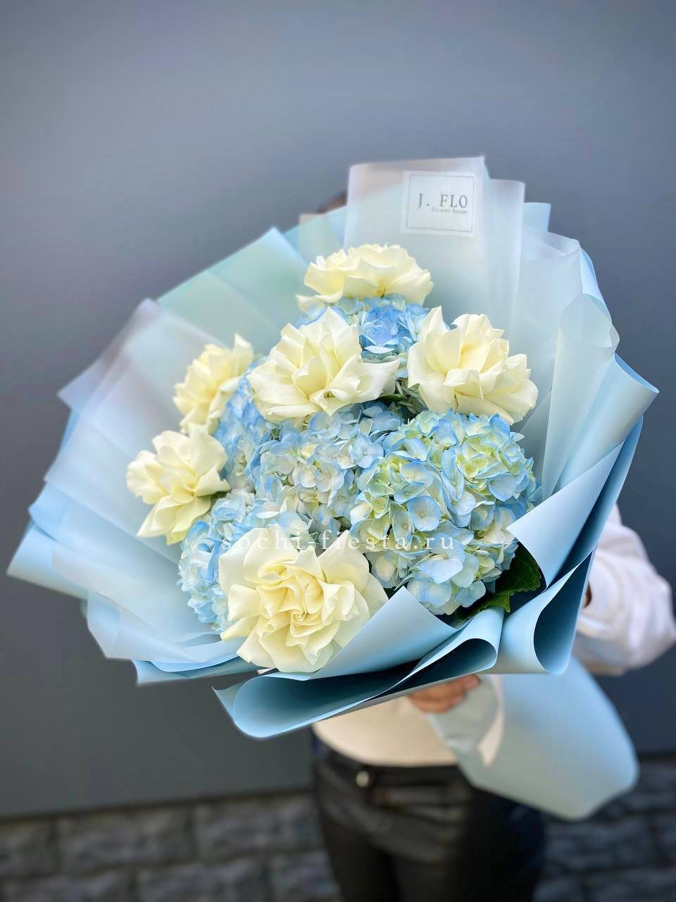 Весенние нарциссы встречаются с бархатными розами в одном букете. Пионовидные бутоны добавляют округлости, а белые и жёлтые оттенки перетекают друг в друга, создавая лёгкое цветовое движение.