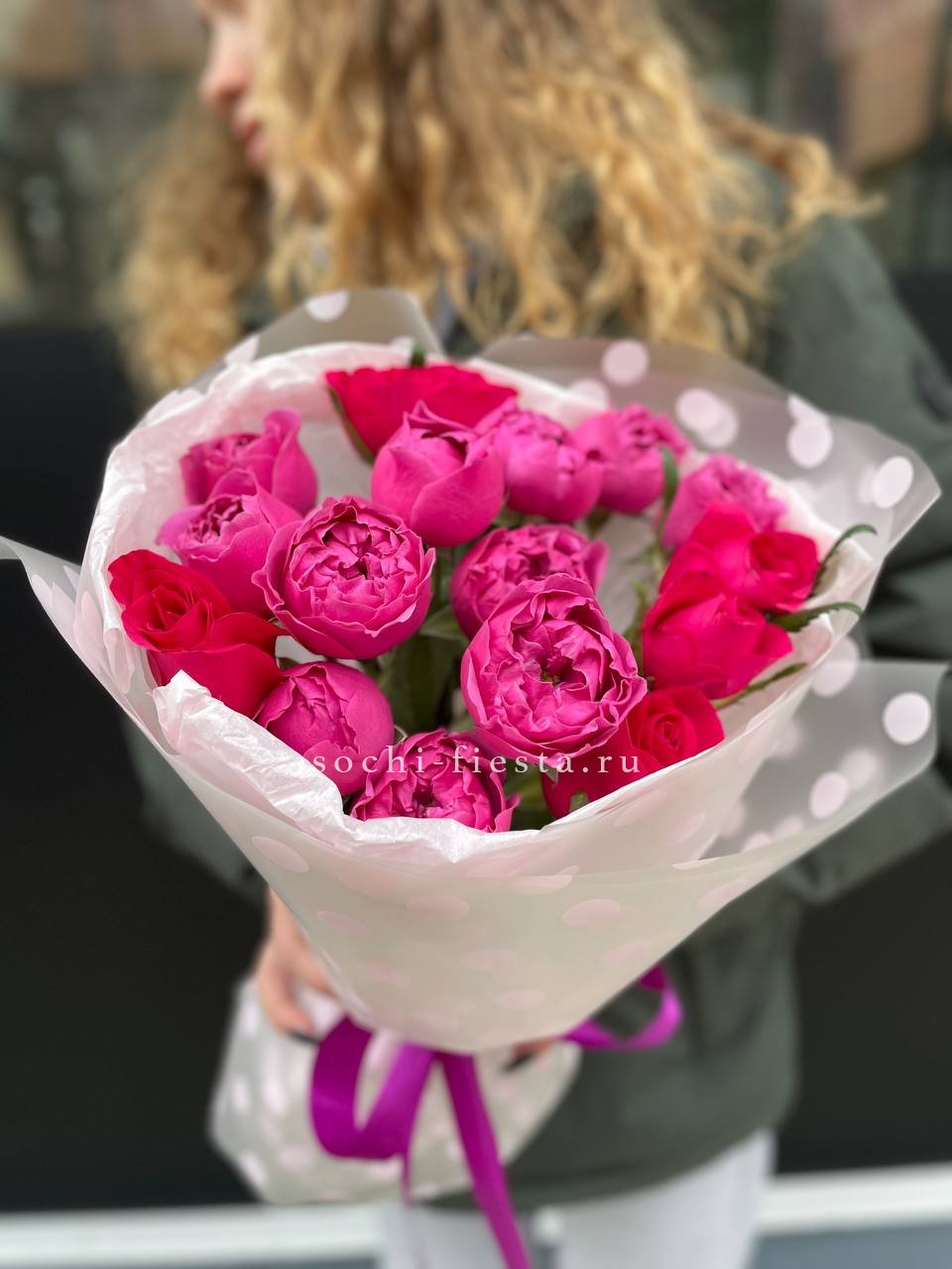 гортензия, розовые пионы Сара Бернар, гипсофила (аналог вне сезона по согласованию) лента, дизайнерская упаковка.