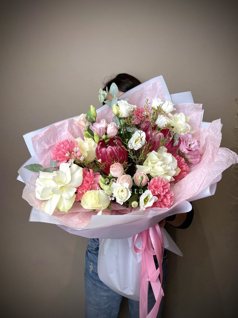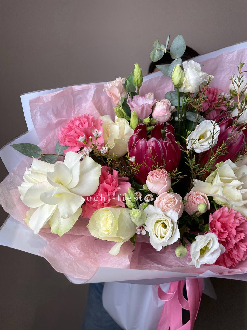 протея, эустома, роза, пионовидная роза, диантус, зелень декортивная, эвкалипт, оформление.