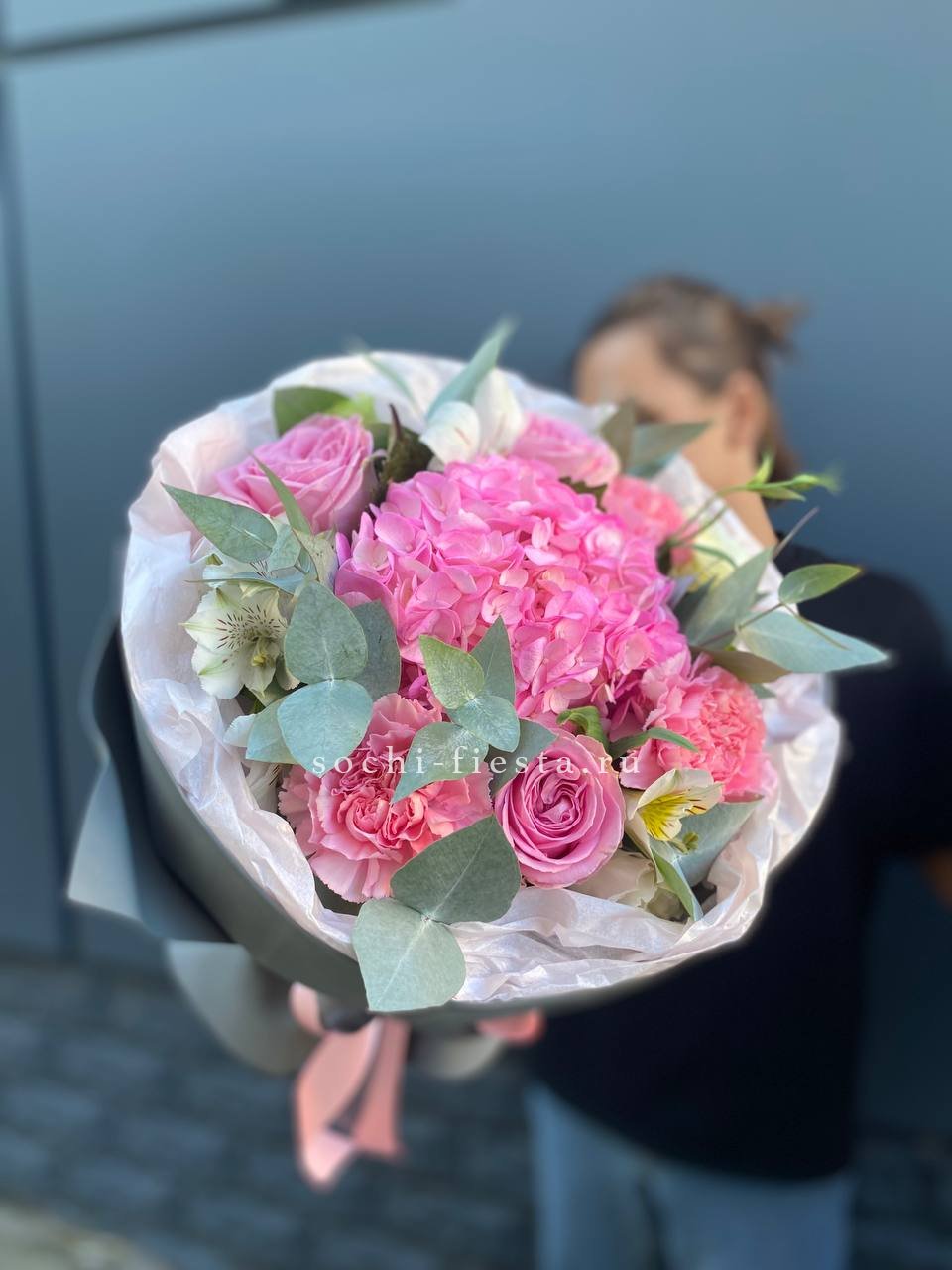 Воздушная композиция с пышными головками маттиолы и яркими диантусами создаёт лёгкое весеннее настроение. Каждый бутон раскрывается по-своему, добавляя объём и живую динамику всему букету.