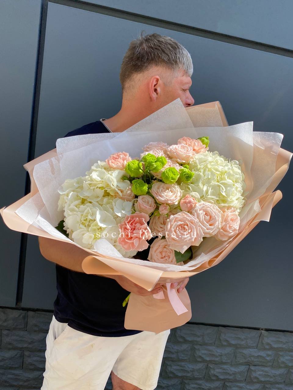 Яркие герберы встречаются с розами и хризантемами в плотной композиции. Гортензия добавляет объём, а хлопок создаёт мягкую текстурную волну по краю букета.