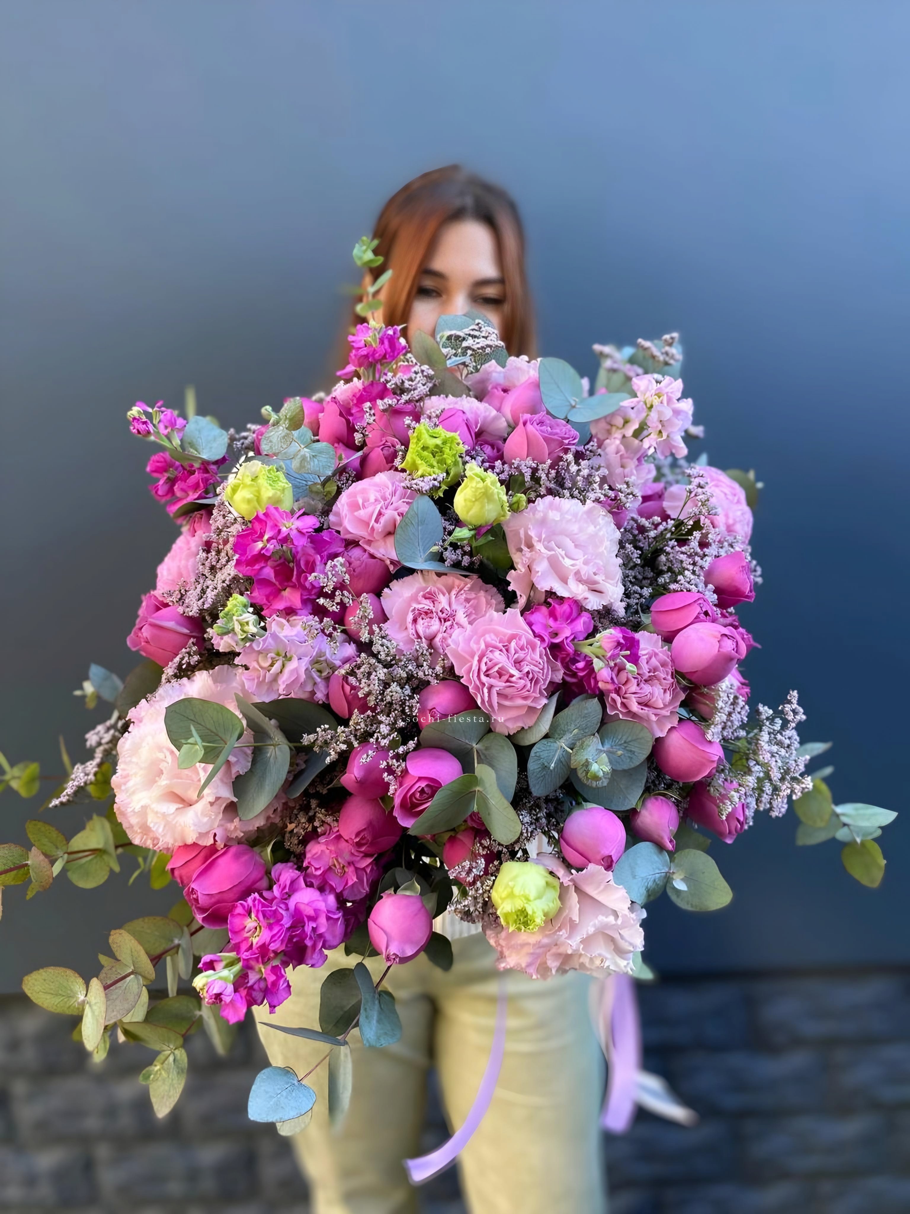Маттиола и эустома создают воздушную текстуру, а пионовидные розы Мисти Баблс добавляют глубину каждому слою. Лимониум и эвкалипт заполняют пространство между бутонами, формируя сложный рисунок. Букет звучит современно и свободно.