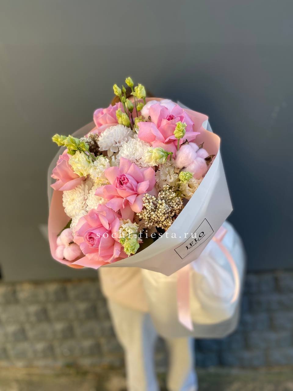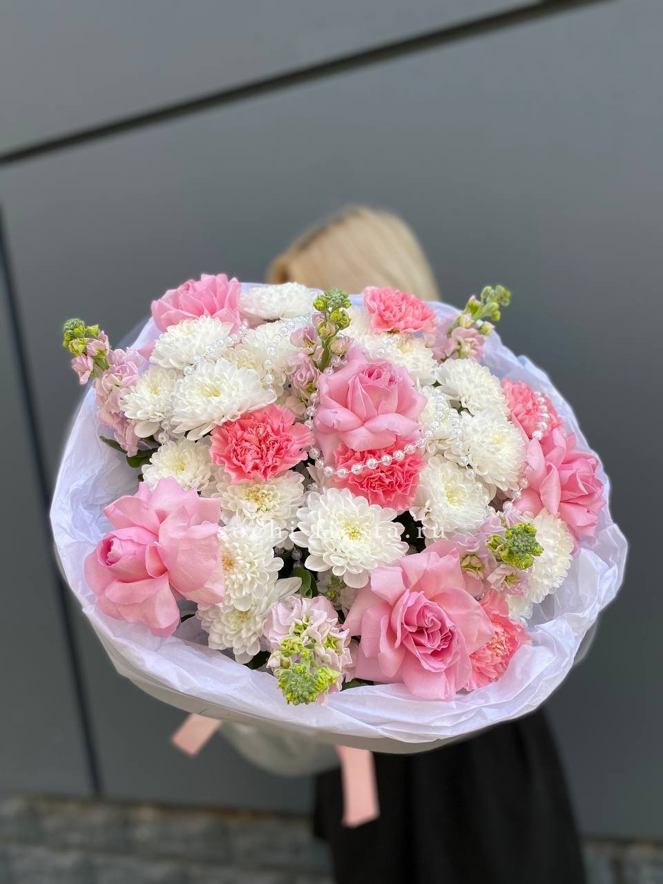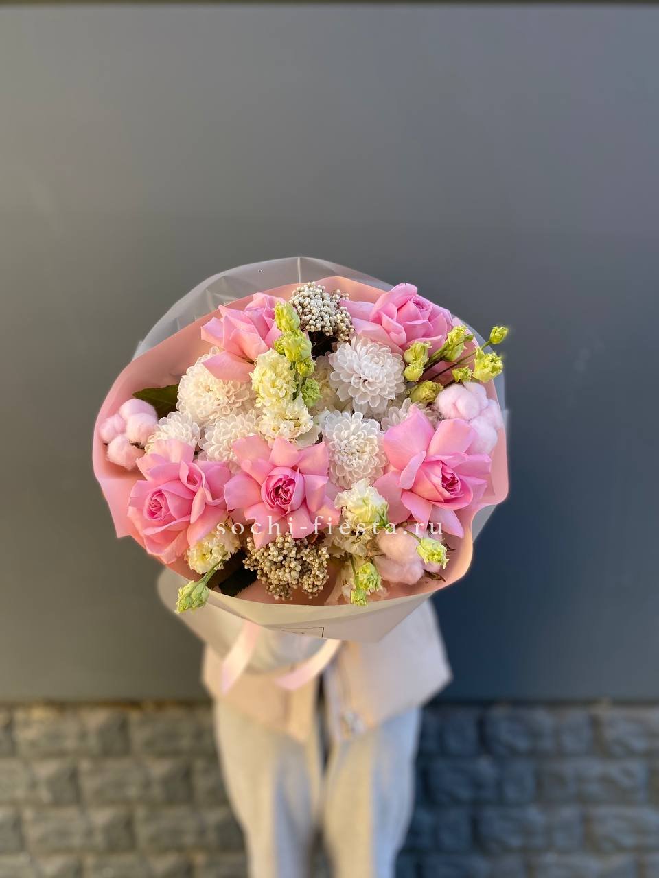 маттиола, диантусы, пионовидные розы Мисти Баблс, эвкалипт, лимониум, эустома лента, упаковка.