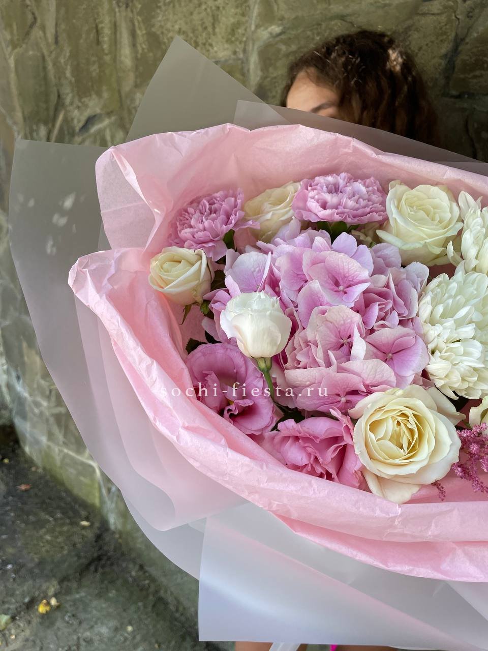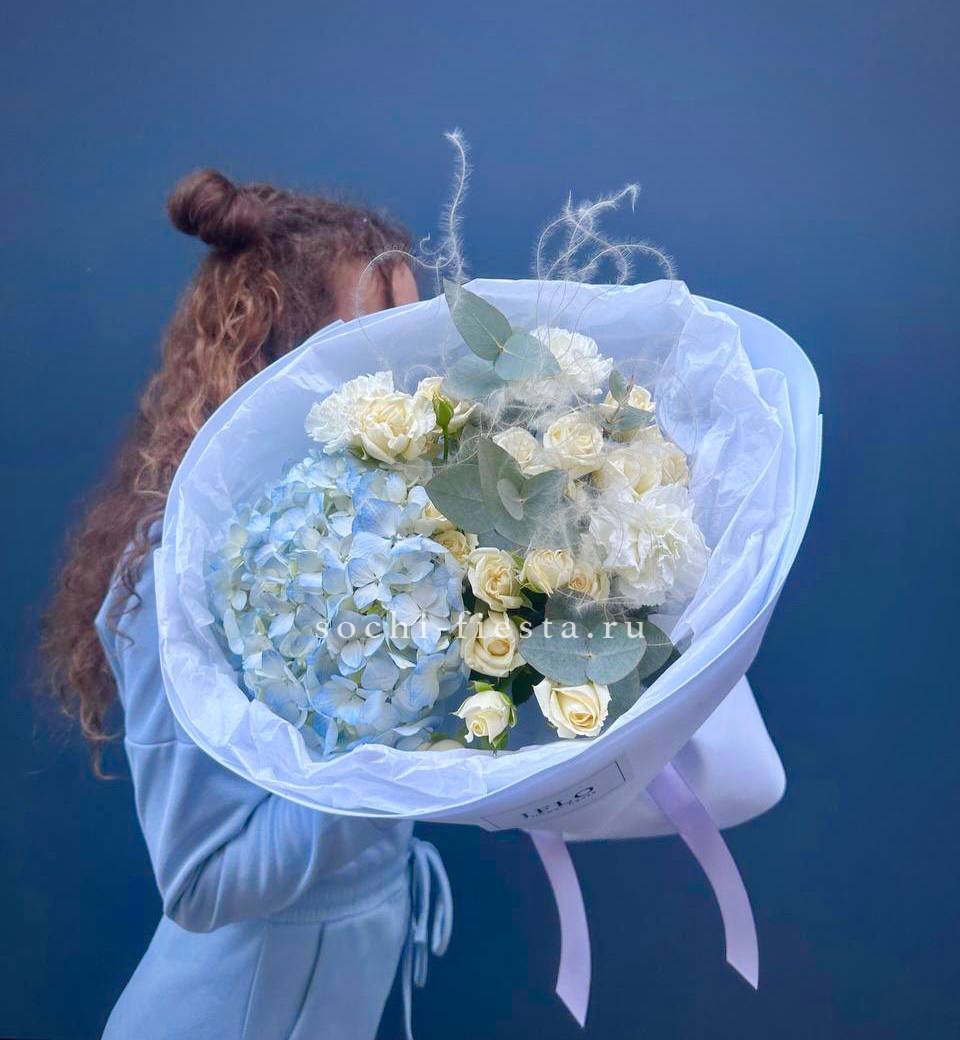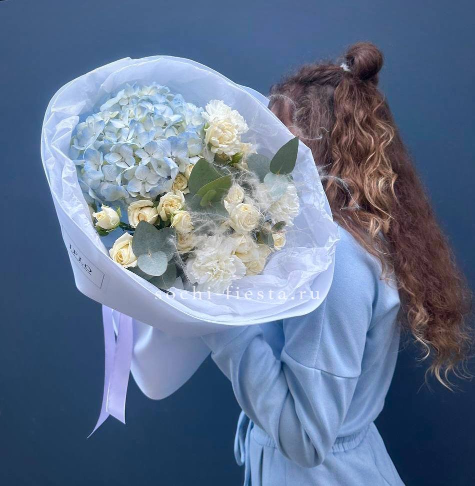 гортензия, роза одноголовая, бомбастик, декоративная зелень, эвкалипт, лента, дизайнерская упаковка.