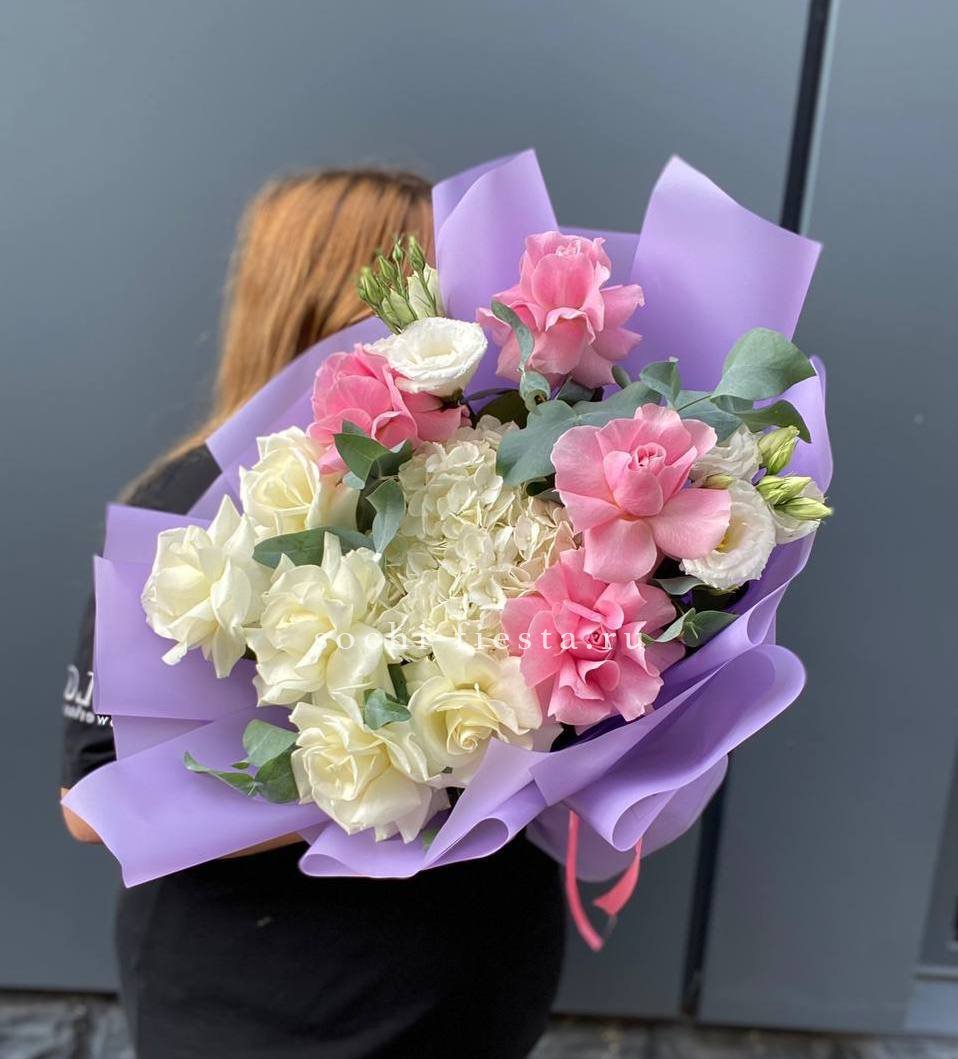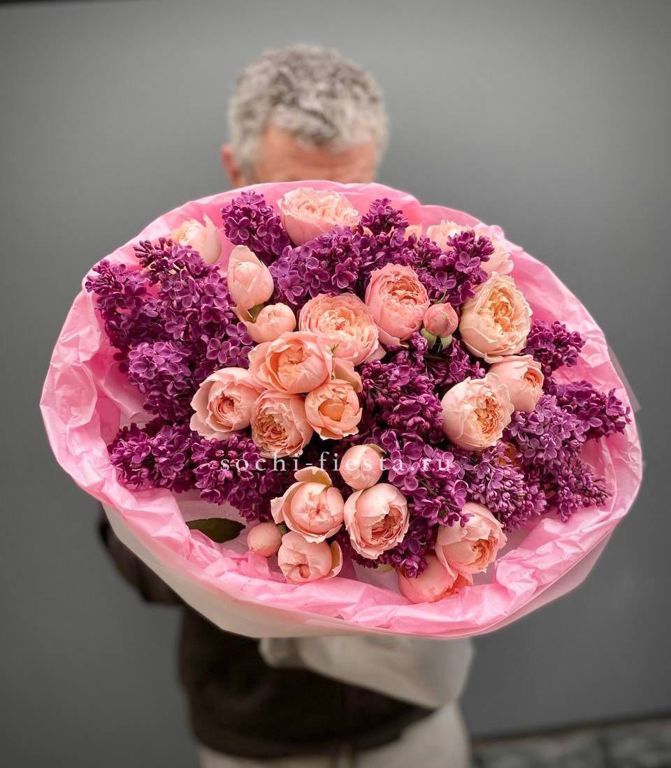 Весенняя встреча сирени и пионовидных кустовых роз в лёгкой упаковке. Ароматный дуэт для тех, кто ценит естественность и простоту.