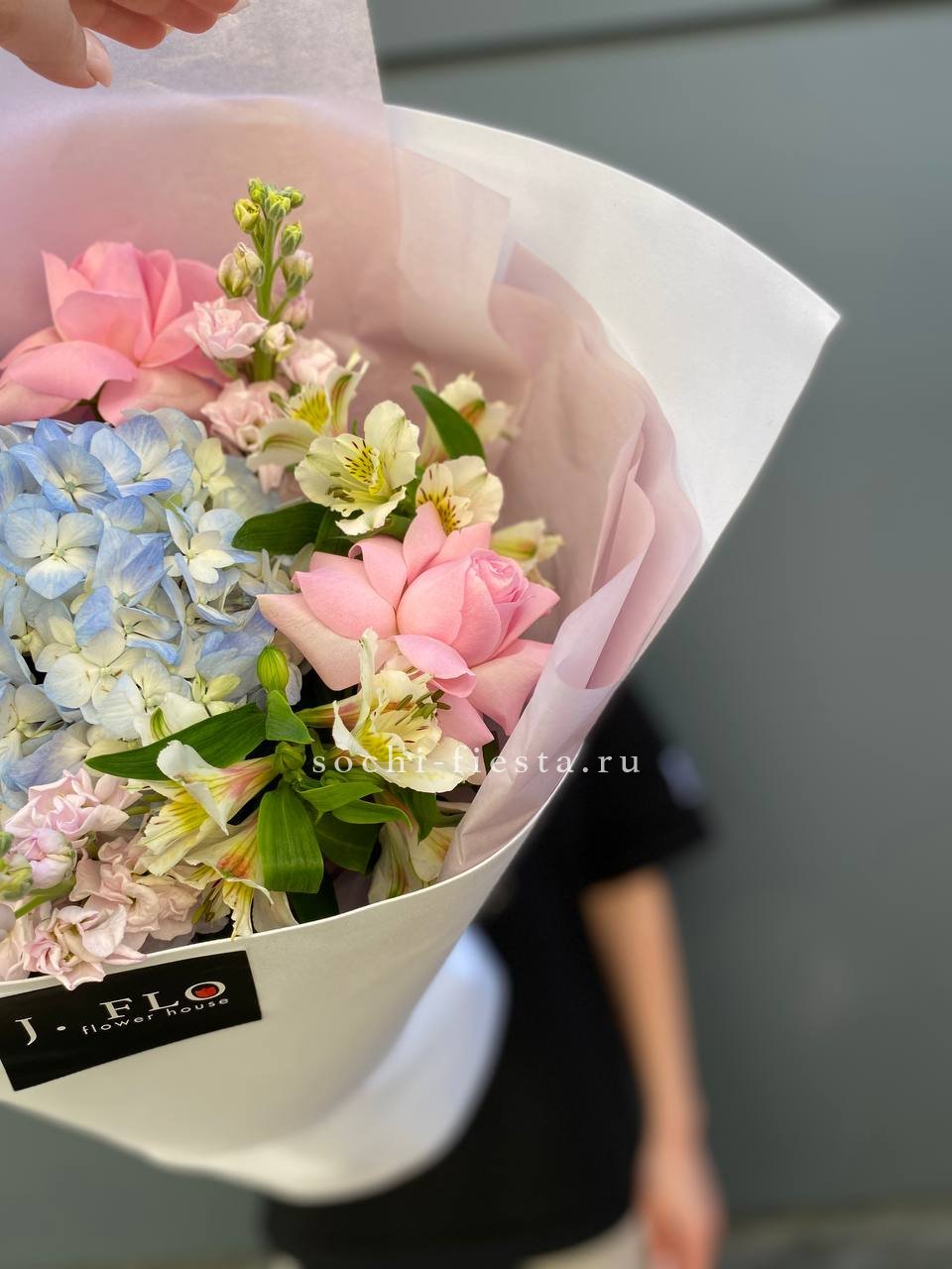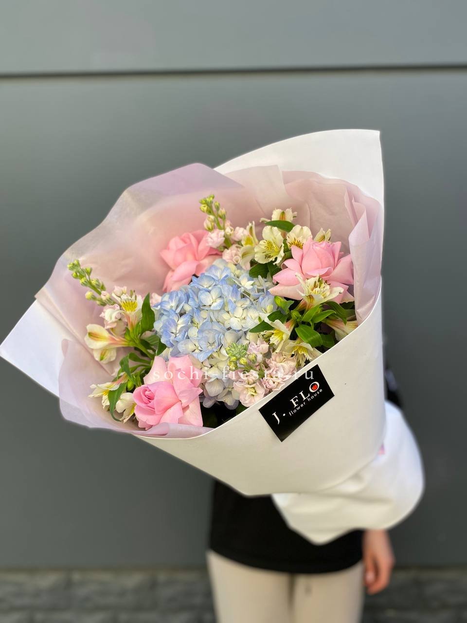 Яркий микс голубых и синих оттенков создает ощущение прохлады и воздуха. Пышные шапки гортензии переплетаются с вертикальными линиями дельфиниума, формируя объемную композицию с выразительным силуэтом.