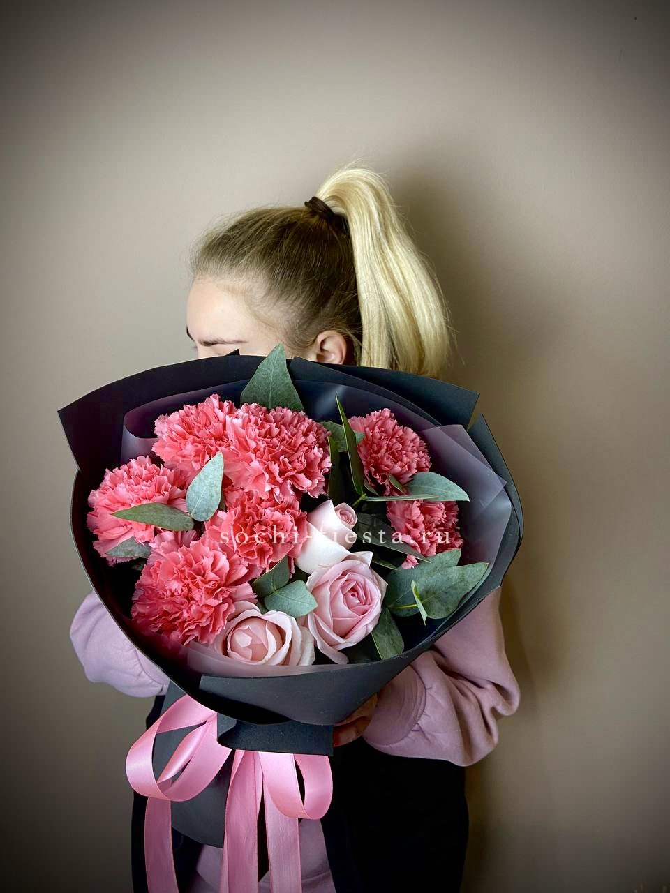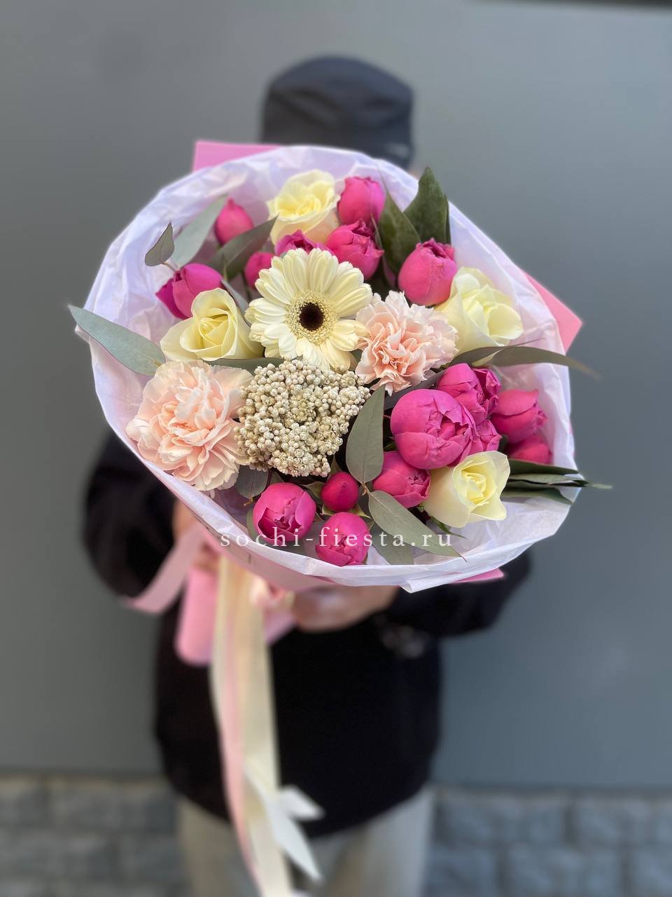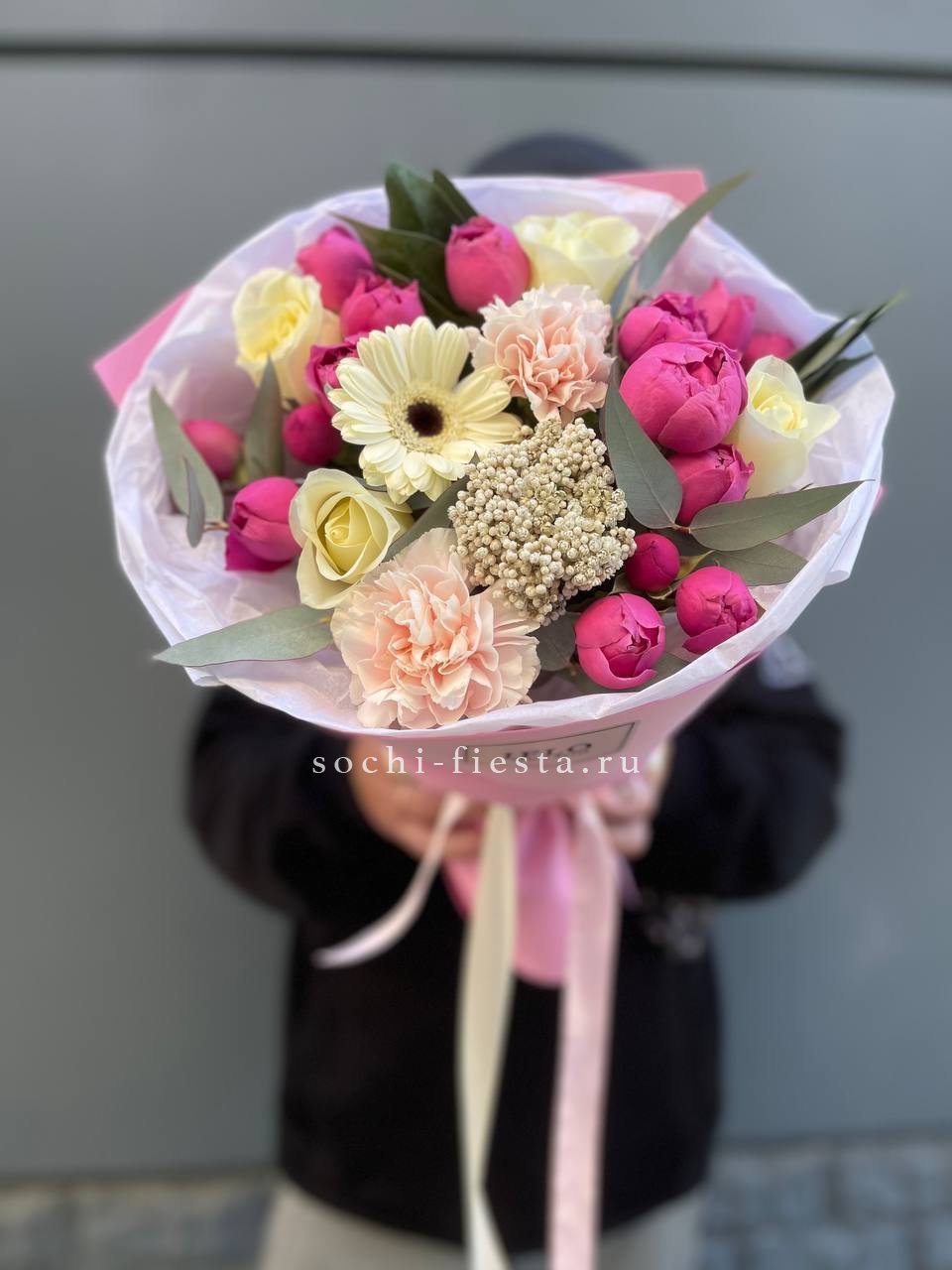гортензия, эустома, кустовая пионовидная роза, альстромерия, диантус, лента, дизайнерская упаковка.