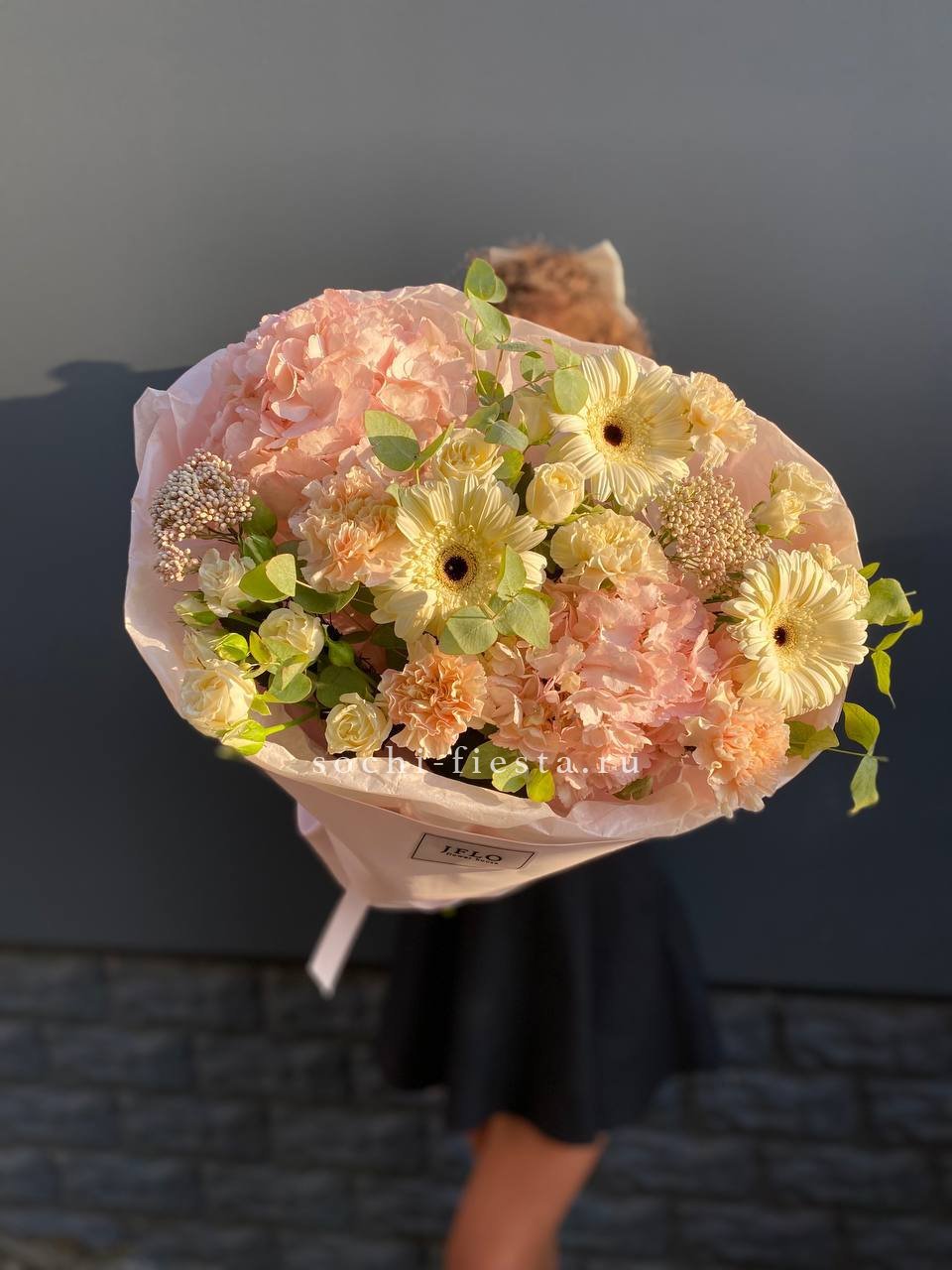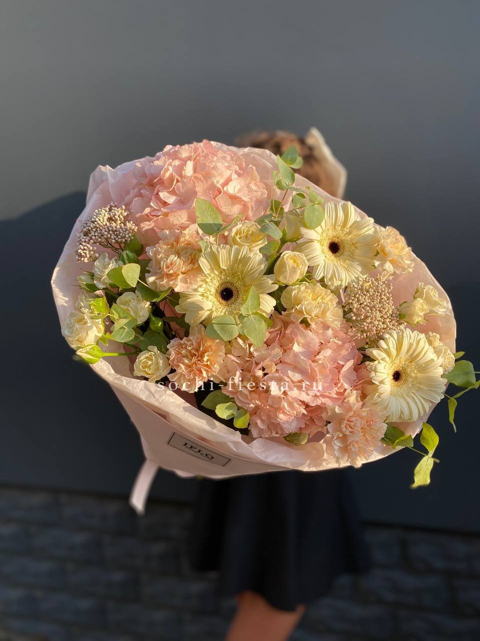 гортензия, эустома, диантус, эвкалипт, пленка.